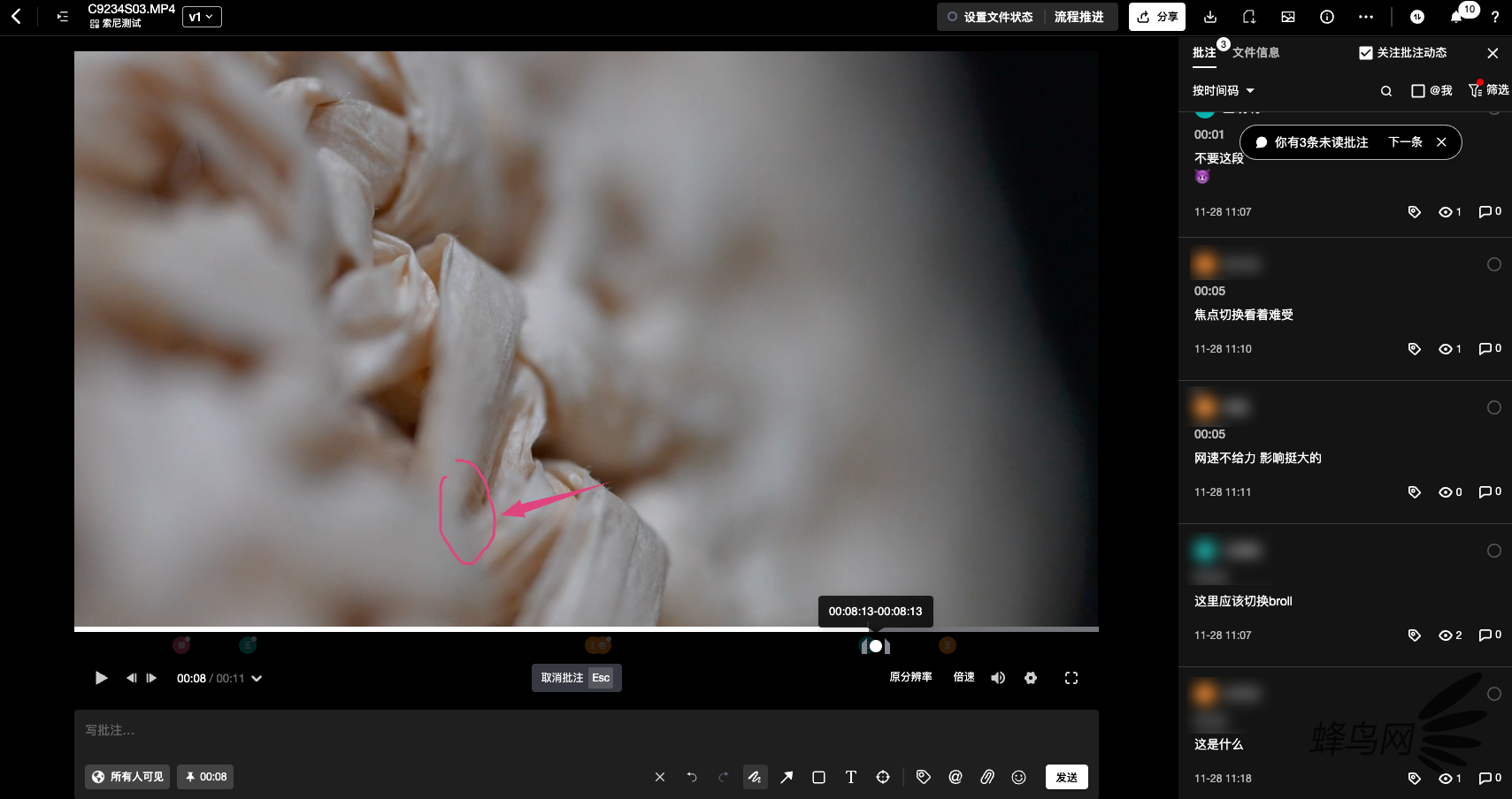实测中,我们将一条短视频上传至平台后,通过分享链接邀请甲方和团队成员审阅。客户无需下载任何软件,直接在网页端就能精准批注——在画面上“圈点画”标注问题,,批注会自动嵌入时间线,后期人员点击批注就能跳转至对应片段,无需手动对照时间码。更实用的是意见自动汇总功能,所有角色的反馈会按时间顺序整理成清单,支持一键导出,避免遗漏;还能创建“字幕”、“声效”、“画面”等自定义标签,后期可按标签筛选优先级修改。对比之前整理客户反馈需要数小时的繁琐,现在几分钟就能理清所有修改需求,审片周期直接缩短一半。